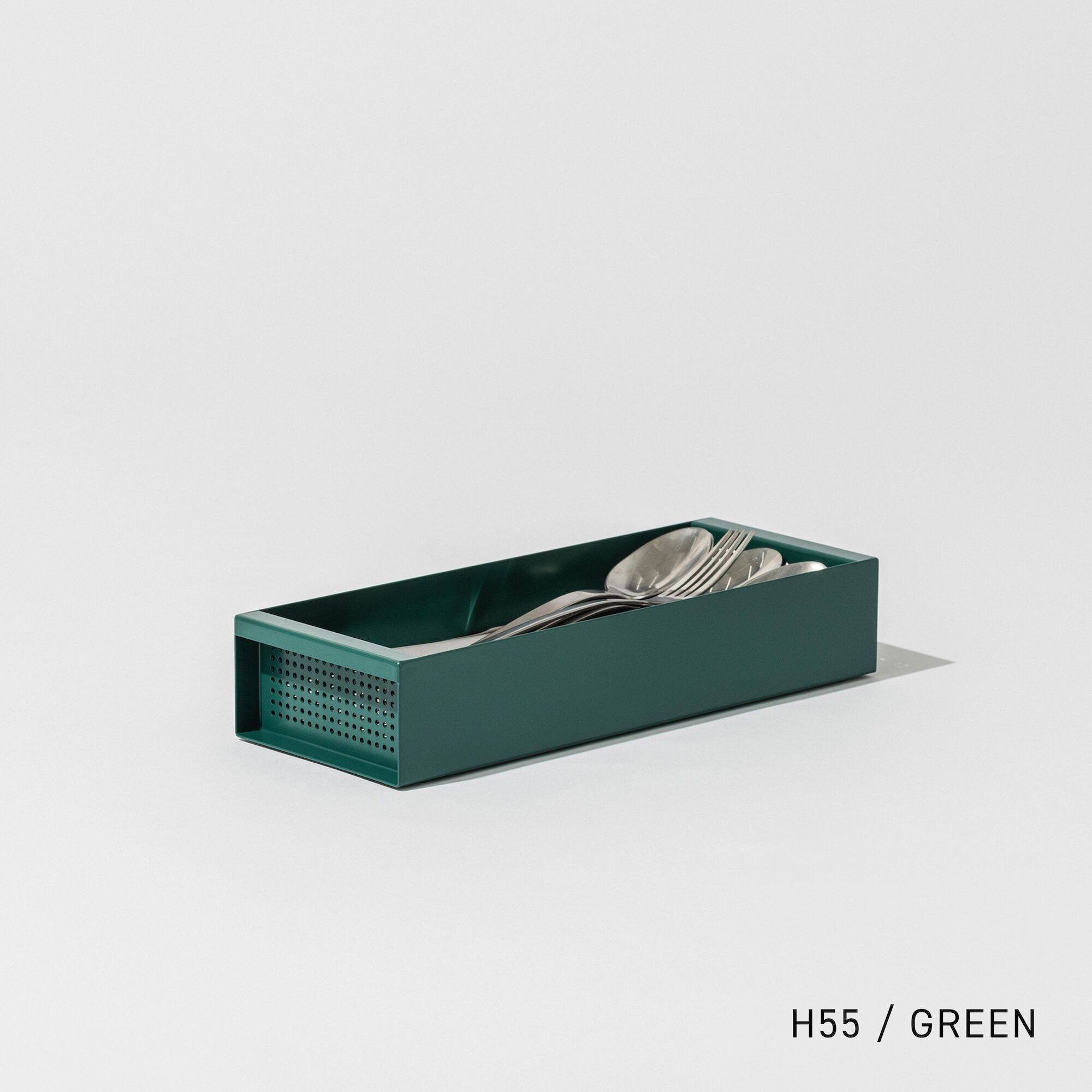 CARGOの設置面は110×290mmと非常にコンパクト。スリムで限られたスペースになることで、CARGOの中では食器が自然と整頓されます。また、コンテナのような箱型の見た目が食器を適度に隠すことで、水切り中でも生活感の少ない整った印象にしてくれます。